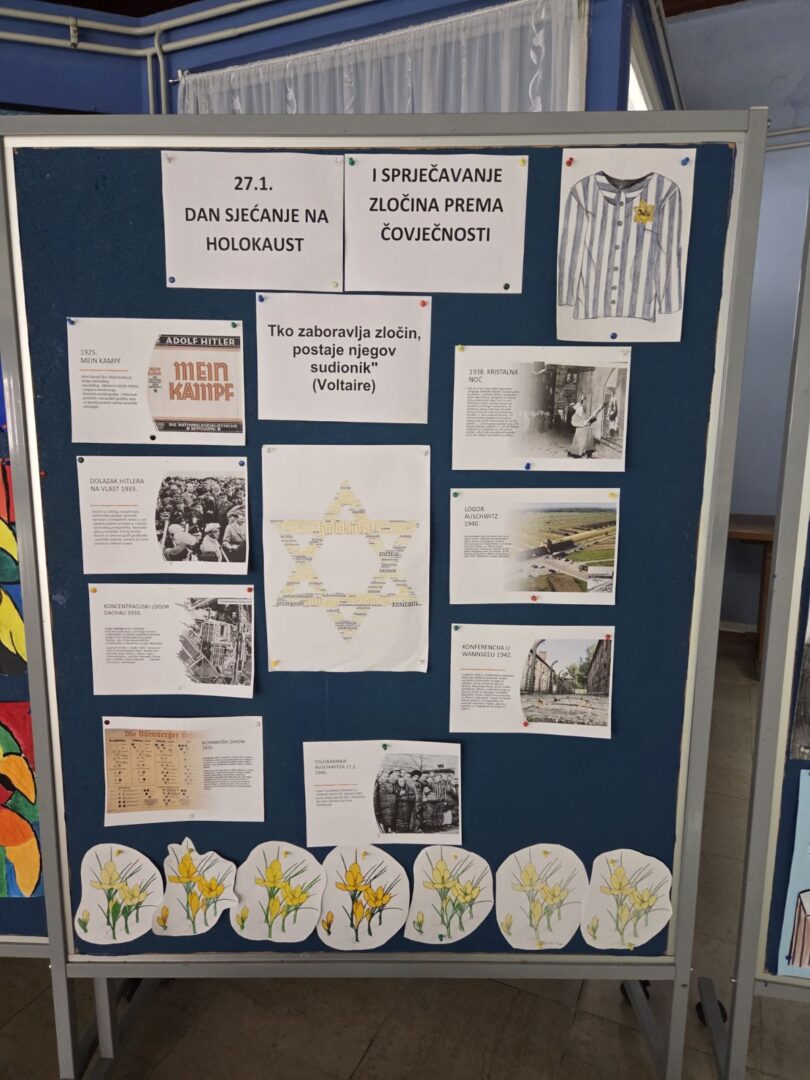 Povodom sjećanja na Dan Holokausta i sprječavanja zločina protiv čovječnosti učitelj informatike Dražen Ćosić  i učiteljica povijesti Jelena Šarčević postavili su školski pano u holu škole.