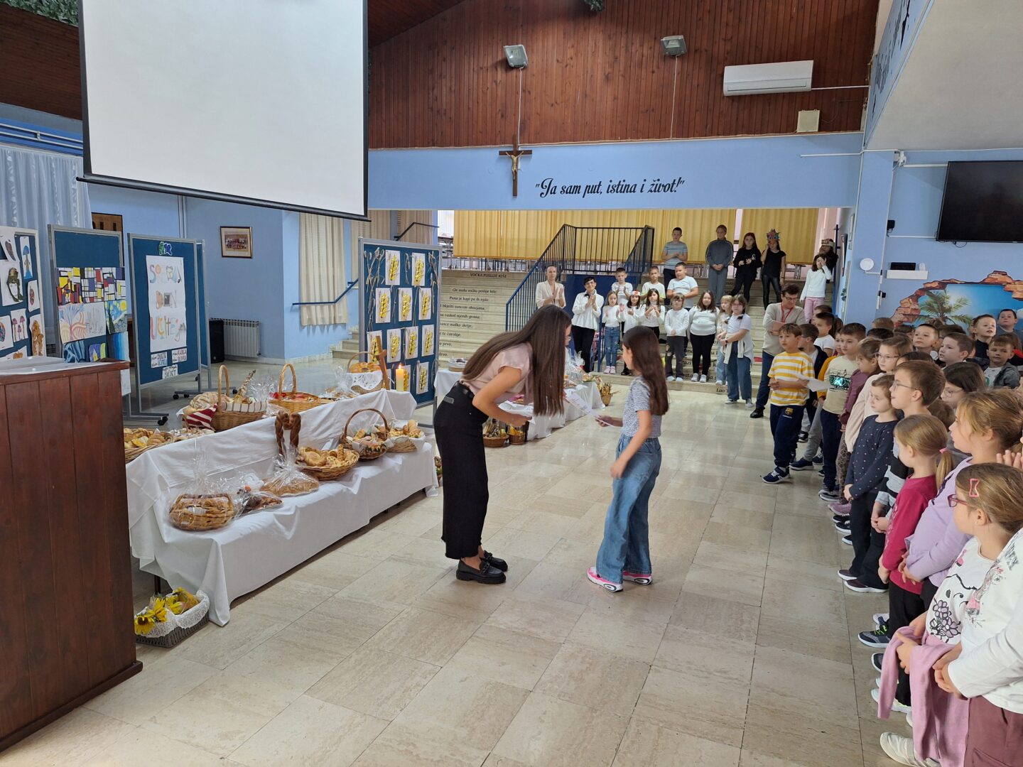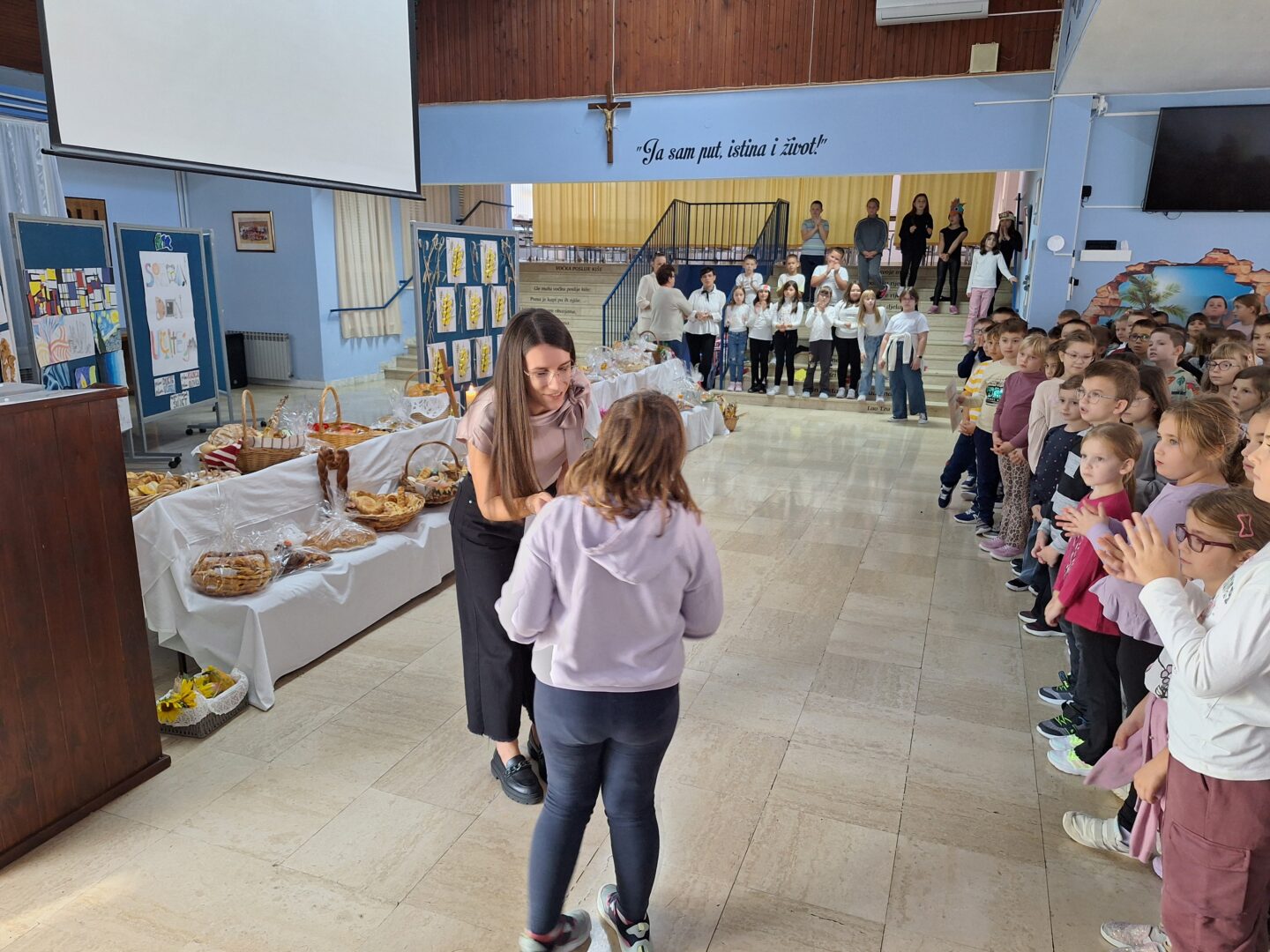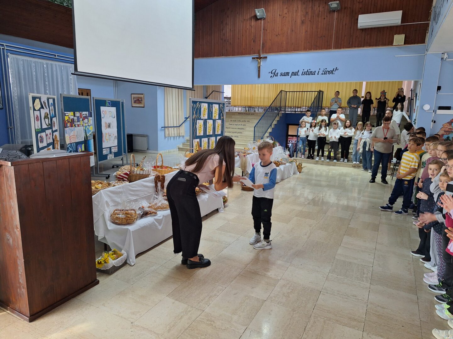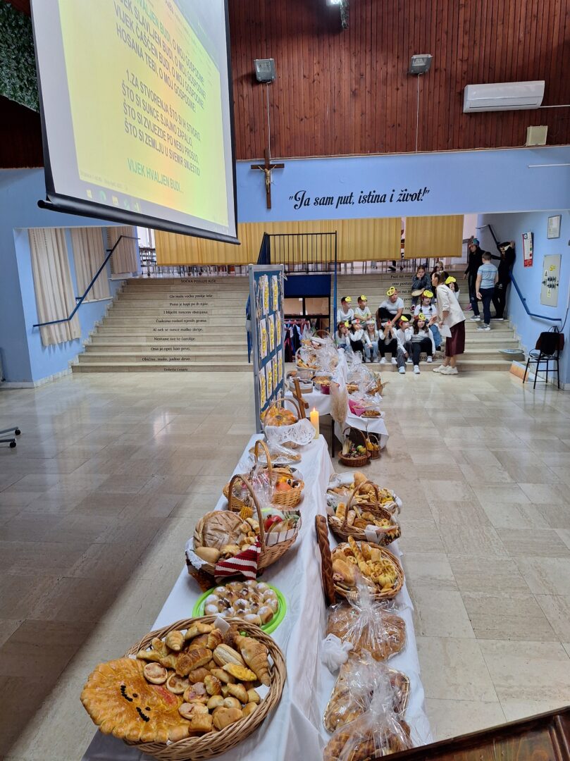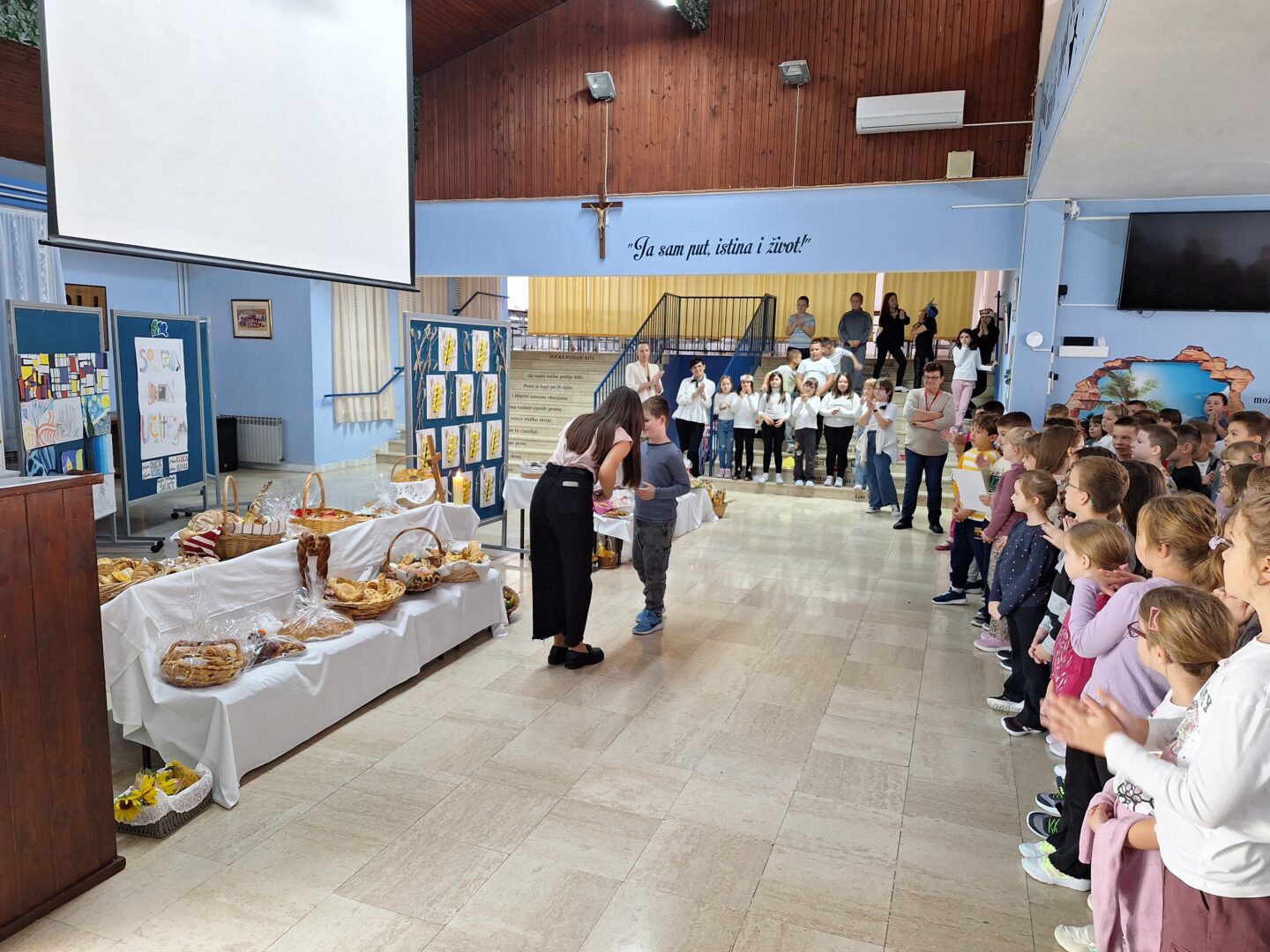 Poseban trenutak bio je kada je časna sestra Ana zajedno sa svim učenicima otpjevala pjesmu zahvale, stvarajući radosno i dirljivo ozračje. Na kraju svečanosti, župnik je posvetio izložene pekarske proizvode, nakon čega su svi zajedno uživali u blagovanju i druženju.