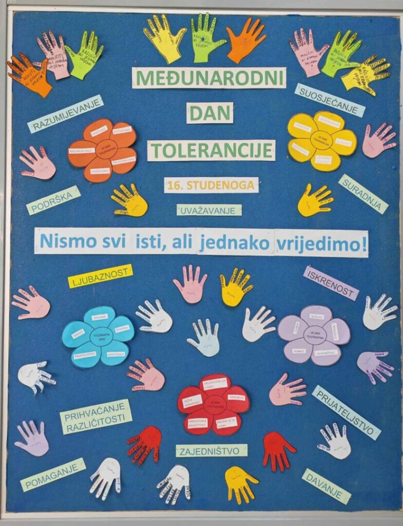 U 1.c razredu je održana radionica na temu Tolerancija – što je to? Učenici su nakon iznošenja svoga mišljenja što je tolerancija kroz predavanje upoznali taj pojam. Izvlačeći kartice s prihvatljivim i neprihvatljivim ponašanjima osvijestili su pojam tolerancije i na kraju izradili cvjetove s porukama.