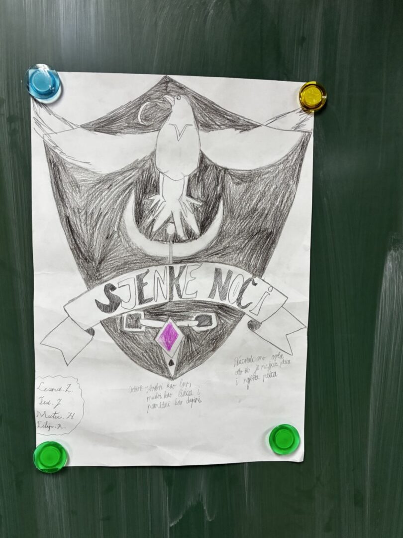 Nakon čitanja ulomka i promišljanja o popkulturi, u koju zasigurno ulaze djela o poznatom čarobnjaku Harryju Potteru, učenici su bili podijeljeni u četiri skupine. Podjela je bila izborna. Svaka skupina je imala zadatak izraditi grb svog „doma“ koji ih simbolično predstavljati. Uz grb naveli su i zajedničke osobine svih članova. Prilikom usmenog predstavljanja trebali su izdvojiti zajedničke osobine, opisati pojedinosti grba. Prema riječima učenika, zadatak im je bio zanimljiv, zabavan i prilika za popodnevno druženje