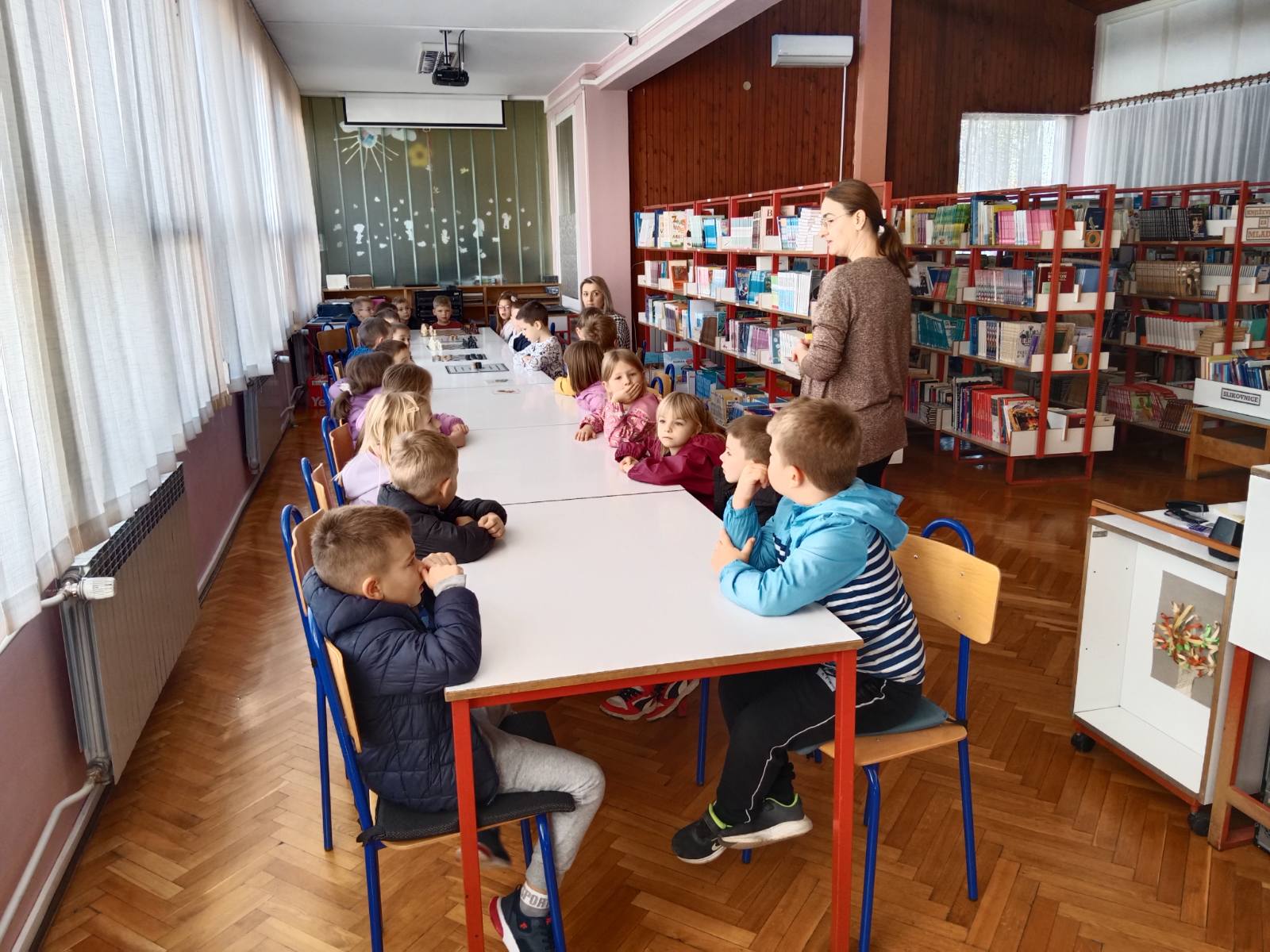 Povodom obilježavanja manifestacije Mjesec hrvatske knjige školsku knjižnicu posjetile su predškolske odgojne skupine Zečići i Ježići u pratnji svojih teta Emilije i Marije i tetka Dinka.